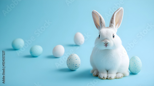 Happy Easter. Cute rabbit with decorated colorful easter eggs on pastel light blue background with copy space. Creative minimal concept for greeting card. Spring invitation, flyer, border, banner.