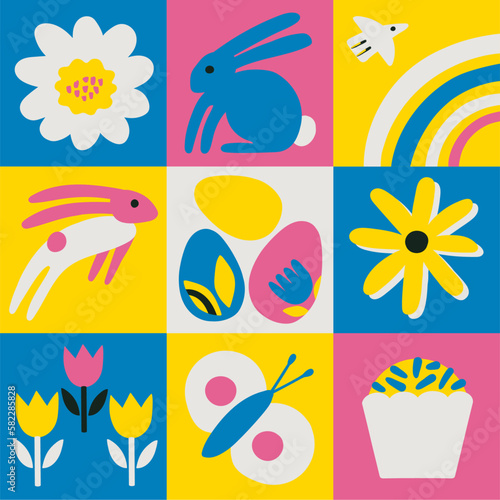 Happy Easter. Patterns. Modern geometric abstract style. A set of vector Easter illustrations. Easter eggs, rabbit. Good for social media post, poster. vector illustration graphics concept.
