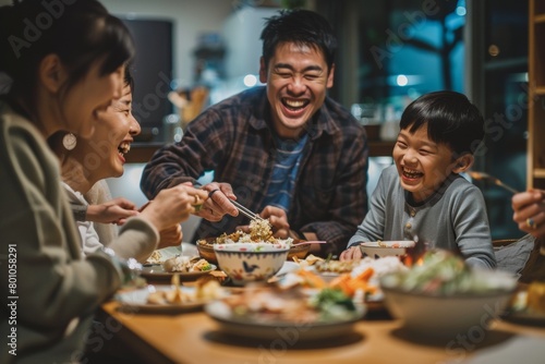 Happy family breakfast hour, father, mother, son, and daughter sit at a table filled with food in a dining room.