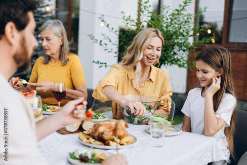 Happy family enjoying dinner together in the garden, thanksgiving day concept