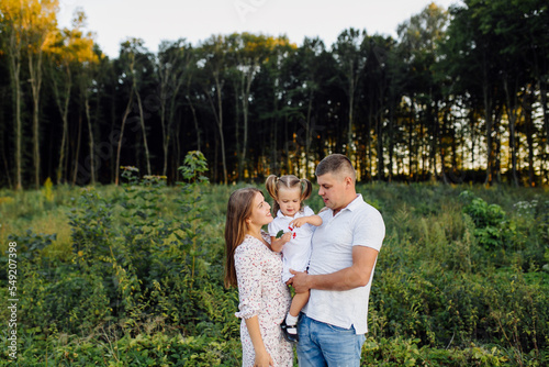 Happy family in a park in summer autumn. Mother, father and baby play in nature in the rays of sunset