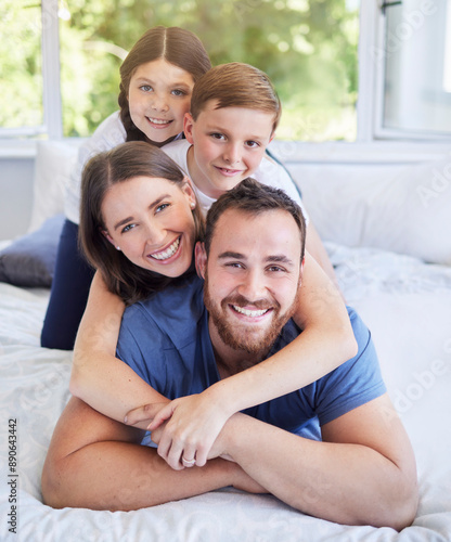 Happy family, portrait and bed with hug for bonding, holiday or weekend together at home. Mother, father and playful children on back with smile for morning, wake up or lying in bedroom at house