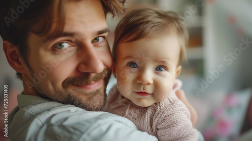 happy father holding a newborn baby in his arms, handsome smiling man, parent, family, infant, kid, child, son, daughter, love, hugs, room, tenderness, father's day
