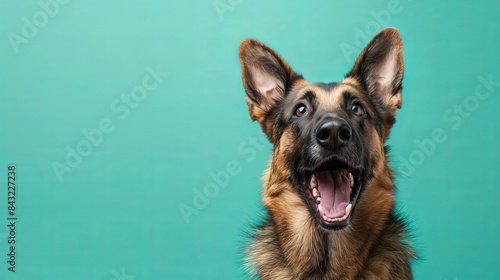 Happy German Shepherd dog with ears perked up sitting against a bright teal background, looking excited and cheerful.