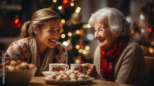 Happy grandmother drinking tea with granddaughter, Christmas tree at home
