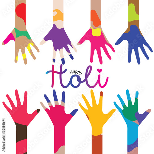 Happy Holi Festival Poster with Colorful Painted Hands and White Background