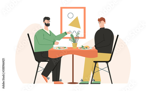 Happy male LGBT family have romantic dinner at home