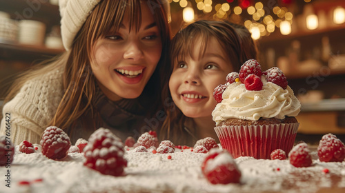 Happy mother and daughter finished decorating cupcakes with fresh berries. Cozy festively decorated kitchen on blurred background. Copy space for text.