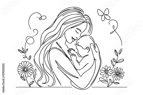 Happy Mother day card. Continuous one line drawing. Woman hold her baby. Vector illustration