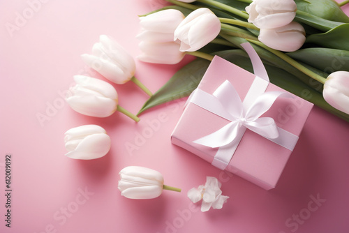 Happy mothers Day concept. Top view of white and pink tulip flowers on pink pastel background. Flat lay. Generative AI