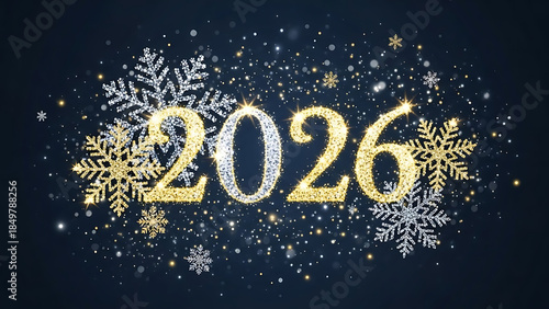 happy new year 2026, new year 2026, 2026 celebration, sparkling numbers, glitter text, festive design, winter holiday, dark blue background, snowflake background, falling snow, shining snowflakes,