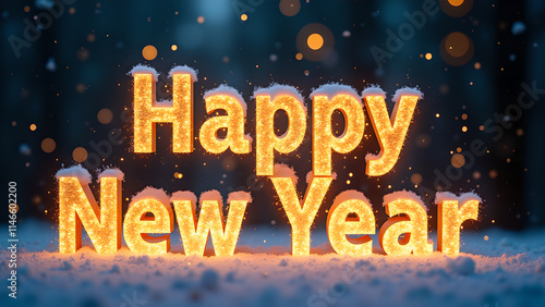 Happy New Year Glowing Text in Snow. Concept of Celebration and New Beginnings.