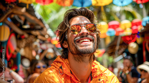 happy people celebrating and having fun at carnival among colorful decorations