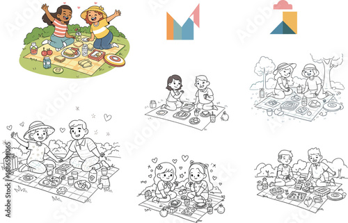 Happy people enjoying picnic, outdoor food, summer gathering, nature lunch, friendship fun, picnic blanket, cartoon illustration, family picnic day