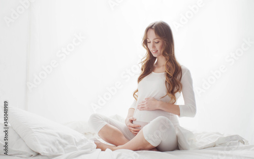 Happy pregnant woman touching her beautiful belly sitting in the bed. Pregnancy, motherhood, and expectation