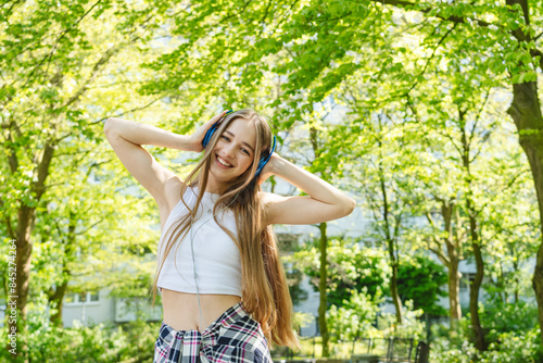 Happy teenage girl listening to music through headphones near trees