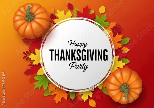 Happy thanksgiving party invitation with pumpkins and autumn leaves
