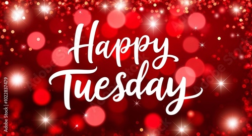 happy Tuesday calligraphic lettering on red bokeh glitter festive sparkles background