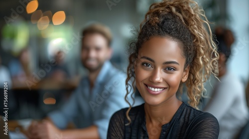 Happy woman smiling at camera, sharing a fun moment at restaurant table