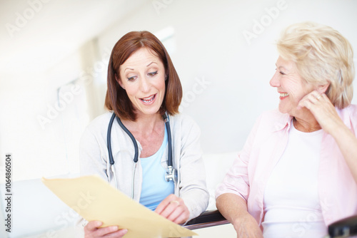 Happy women, doctor or patient with prescription for elderly care, consultation or medical history at clinic. Healthcare, worker or employee talking to senior person with a disability for insurance