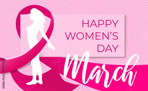 Happy women's day - international woman spring holiday - 8 march. Realistic pink ribbon and girl silhouette on stripes background. Concept design banner, poster, greeting card. Vector illustration
