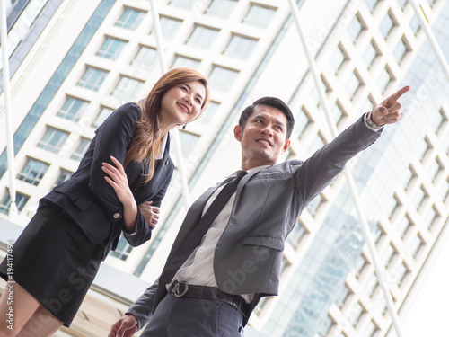 Happy Young Asian business people standing in front of a modern office building.business people success and cheerful with thier business.success business concept