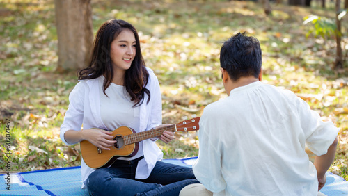 Happy young attractive Asian woman and mother together playing ukulele sing a song at the park garden during travel in summer holiday vacation