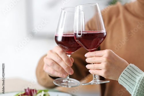 Happy young couple drinking wine on romantic date in cafe, closeup