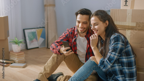 Happy Young Couple Sitting on the Floor of the Newly Rented / Purchased Apartment and Use Smartphone. Unpacked Cardboard Boxes and Covered Furniture in the Modern Bright Sweet Home.