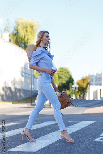 Happy young female student crossing the street