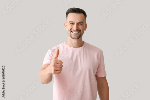 Happy young man showing thumb-up on light background