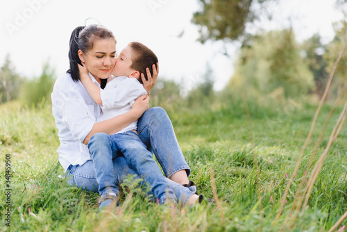 Happy young mother is playing with her baby in a park on a green lawn. Happiness and harmony of family life. Great family vacation. Good weekend. Mothers Day. Holiday. The concept of a happy family
