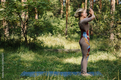 Happy young woman standing in yoga pose on the grass in the park. Practicing yoga with trees in the background