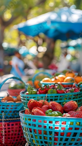 Harvest Bounty: Fresh, vibrant fruits and vegetables overflowing in woven baskets at a bustling outdoor market, offering a colorful display of nature's abundance.