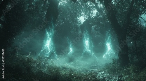 Haunted forest, eerie glowing trees, misty atmosphere, digital holographic spirits