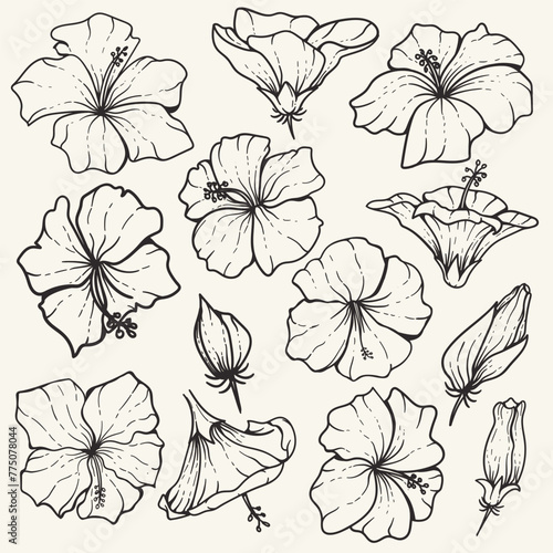 Hawaiian Hibiscus rosa-sinensis in minimalist line floral, hand drawn flower suitable for wedding invitation covers, beauty products, and backgrounds.