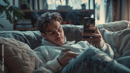 He is playing a first person shooter video game while lying on a couch, holding his smartphone horizontally in landscape mode. Point of view shot.