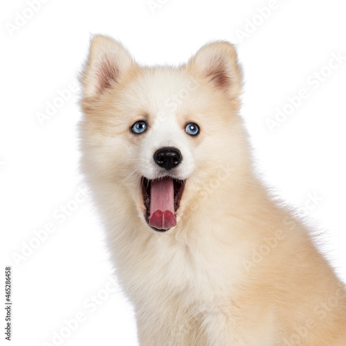 Head shot from adorable fluffy Pomsky dog pup. Looking towards camera, mouth wide open yawning showing pink tongue. Isolated on a white background.