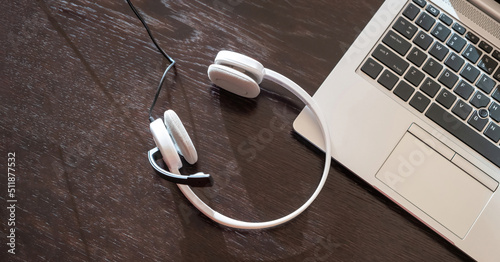 Headset on a laptop, wooden table. Call center, home office, customer support, help desk
