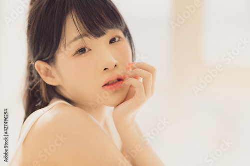 Headshot portrait of young asian woman sexy girl with long hair using as background cosmetics woman makeup fashion people model