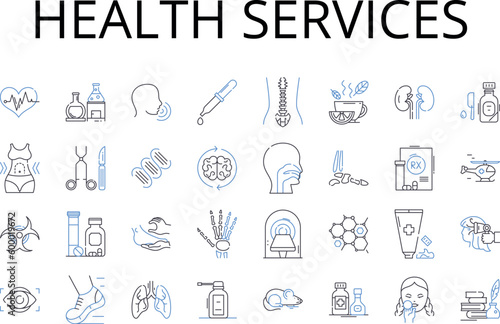 Health services line icons collection. Medical care, Wellness facilities, Healthcare institutions, Physical therapy, Healthcare providers, Holistic health, Clinical practice vector and linear