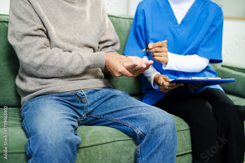 Healthcare nurse explains report to senior man in home visit. A moment of care, trust, and clarity in elderly consultation. Real people in medical discussion concept