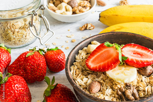 healthy breakfast strawberry and banana muesli with oats, granola and nuts in a bowl