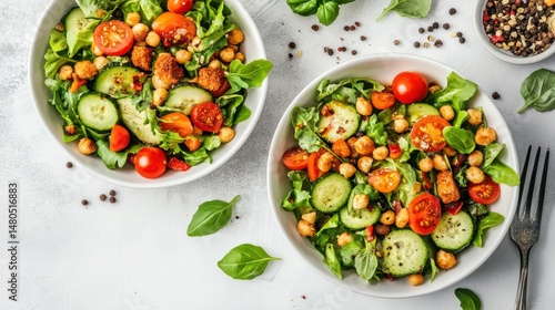 Healthy clean eating layout, vegetarian food and diet nutrition concept. Various fresh vegetables ingredients for salad on white table background, top.