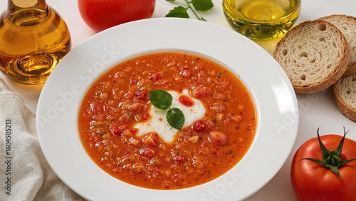 Healthy cold soup displayed with vibrant ingredients on a white serving dish