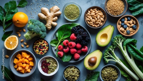 Healthy food choices featuring fruits, vegetables, seeds, superfoods, cereals, and leafy greens on a clean background