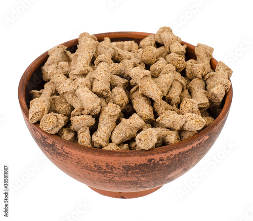 Healthy food products. Extruded rye bran on white background