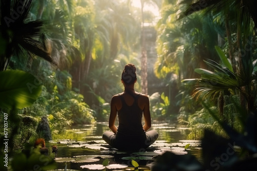 Healthy lifestyle, states of mind concept. Woman silhouette meditating or making yoga in dense jungles and illuminated with sun light