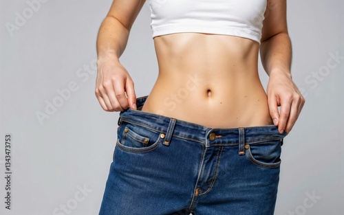 Healthy Lifestyle Transformation: Slim Woman Celebrating Weight Loss with Loose Jeans Fit
