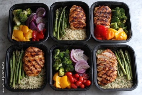 Healthy meal prep containers with chicken quinoa and vegetables